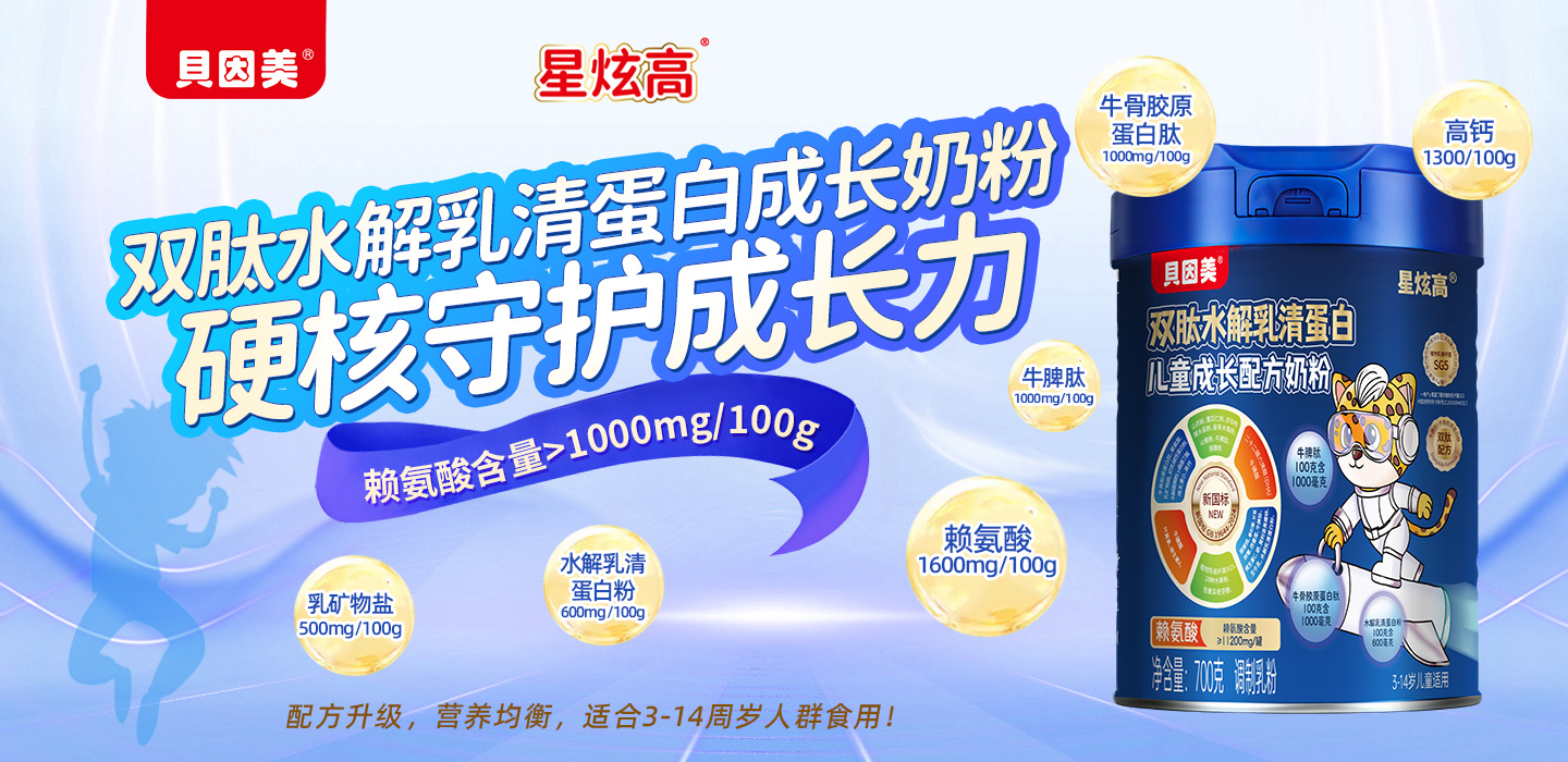 貝因美星炫高兒童成長配方奶粉,新國標(biāo)認(rèn)證,GB19644-2024,適合3-14周歲人群食用!嚴(yán)選優(yōu)質(zhì)奶源,源頭把控!賴氨酸含量>1000mg/100g,高含量更營養(yǎng)!同時,每100g更添加乳礦物鹽500mg,高鈣1200mg,初乳堿性蛋白粉20mg,水解蛋黃粉10mg,葉黃素162mg,同時富含多種維生素和礦物質(zhì),均衡營養(yǎng)配比,好消化好吸收,守護(hù)成長健康!