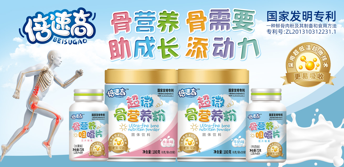 品牌名稱:倍速高 主營產(chǎn)品:倍速高超微骨營養(yǎng)粉,咀嚼片 品牌特色:科學營養(yǎng) 助力健康
