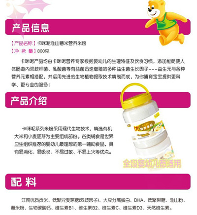 卡咪呢有機(jī)米粉系列是專(zhuān)為中國(guó)寶寶設(shè)計(jì)的營(yíng)養(yǎng)輔食,選用有機(jī)大米,科學(xué)搭配維生素AD等維生素,還特別添加;撬、DHA、AA等有助智力發(fā)育的營(yíng)養(yǎng)成分,富含15種營(yíng)養(yǎng)素,F(xiàn)上?ㄟ淠啬笅胗闷酚邢薰久嫦蛉珖(guó)空白市場(chǎng)區(qū)域誠(chéng)招卡咪呢有機(jī)米粉代理商。