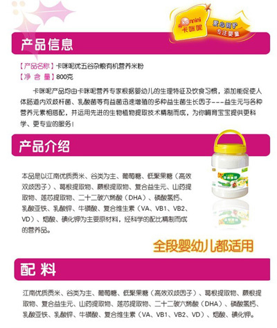 卡咪呢有機米粉系列是專為中國寶寶設計的營養(yǎng)輔食,選用有機大米,科學搭配維生素AD等維生素,還特別添加;撬、DHA、AA等有助智力發(fā)育的營養(yǎng)成分,富含15種營養(yǎng)素,F上海卡咪呢母嬰用品有限公司面向全國空白市場區(qū)域誠招卡咪呢有機米粉代理商。