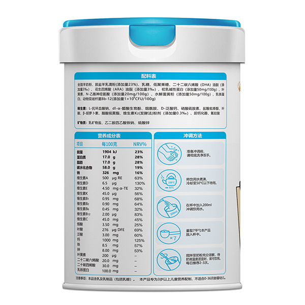 慧滋小狀元兒童成長配方羊奶粉,甄選奶源,嚴(yán)選產(chǎn)地,采用先進(jìn)自動化生產(chǎn)設(shè)備,產(chǎn)品經(jīng)過嚴(yán)格檢驗(yàn),多重保障,品質(zhì)放心。根據(jù)成長階段營養(yǎng)需求科學(xué)配比多重營養(yǎng)素,每100g中含脫鹽羊乳清粉23g、乳鐵蛋白100mg、水解蛋黃粉50mg、初乳堿性蛋白50mg,更添加動物雙歧桿菌Bb-12、益生元、葉黃素、DHA&ARA、N-乙酰神經(jīng)氨酸,以及多種維生素與礦物質(zhì)等微量元素,合理配比,營養(yǎng)美味,奶香濃郁,親和好吸收,給力護(hù)成長。
