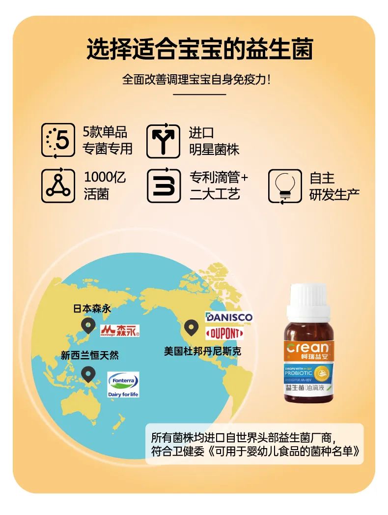 呵瑞益安短雙歧桿菌M-16V益生菌油滴液,采用進(jìn)口菌株,且選用菌株符合衛(wèi)健委【可用于嬰幼兒食品的菌種名單】。添加進(jìn)口原料,如瑞典AAK進(jìn)口油脂及進(jìn)口水溶性膳食纖維,安全配方,自主研發(fā)生產(chǎn),每瓶添加1000億活性益生菌,專利滴管,精準(zhǔn)控量,油滴嵌入包裹工藝+全程充氮;罟に嚕卫捂i定活性。