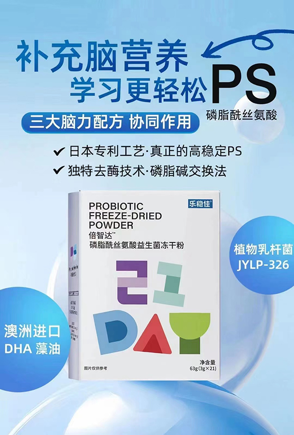 樂穩(wěn)佳倍智達磷脂酰絲氨酸益生菌凍干粉,澳洲進口DHA藻油,植物乳桿菌JYLP-326,日本專利工藝·真正的高穩(wěn)定PS,獨特去酶技術(shù)·磷脂堿交換法,三大腦力配方,協(xié)同作用,補充腦營養(yǎng),學(xué)習(xí)更輕松。