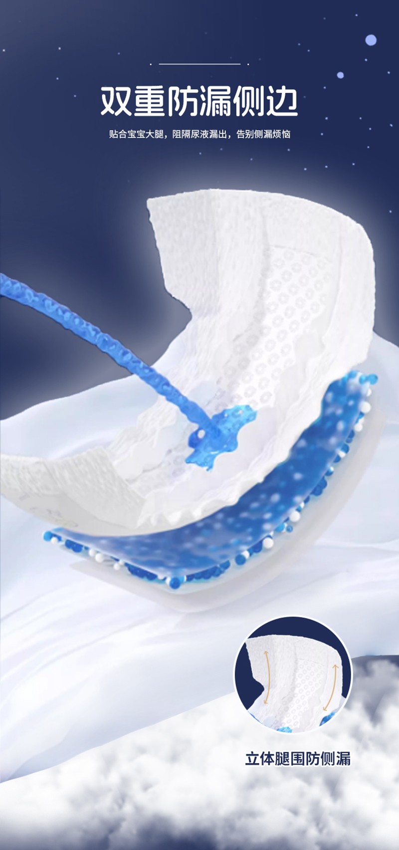 雙重防漏側(cè)邊:立體護(hù)圍,貼合寶寶大腿,阻隔尿液漏出,告別側(cè)漏煩惱。
