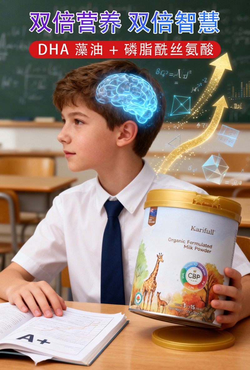 加賦有機(jī)奶粉,三大產(chǎn)能營養(yǎng)素含量較高,滿足3-15歲兒童成長所需的基礎(chǔ)要求,PS 180mg,初乳堿性蛋白200mg,葉黃素脂10mg等其他的維生素礦物質(zhì),補(bǔ)充腦力,視力,骨骼力,免疫力等其他需要