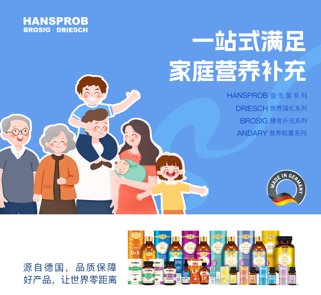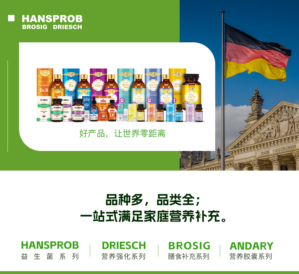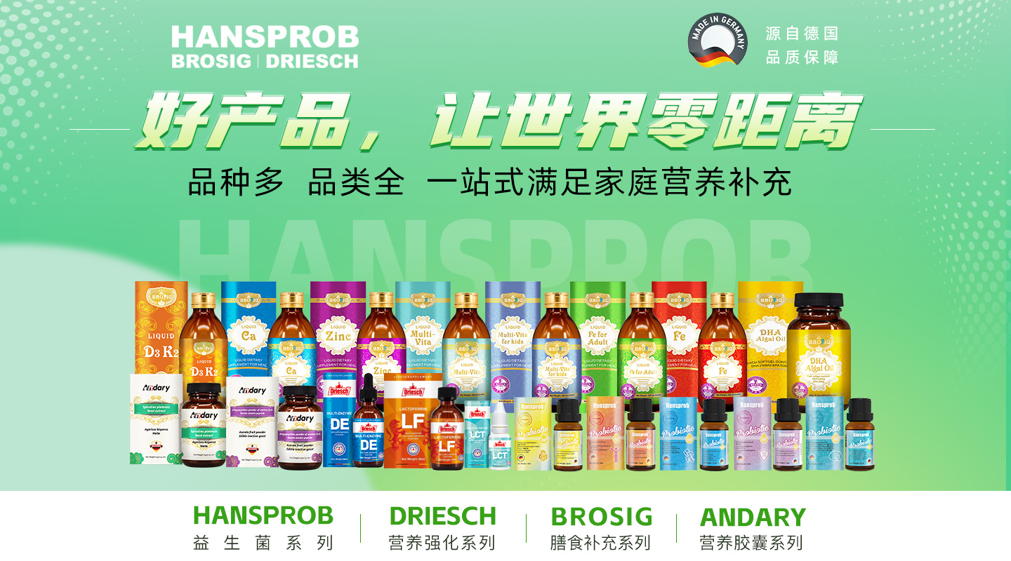 集團旗下?lián)碛袣W盟品牌Hansprob(漢思鉑),以及Brosig和Driesch等眾多專業(yè)領(lǐng)域品牌。這些品牌均深耕于高端營養(yǎng)食品領(lǐng)域,以進口優(yōu)質(zhì)德國營養(yǎng)食品為核心業(yè)務(wù)。秉承“好產(chǎn)品,世界零距離”的企業(yè)理念,公司致力于為全球?qū)殞毤八腥巳禾峁┳畎踩、最?yōu)質(zhì)的營養(yǎng)食品。