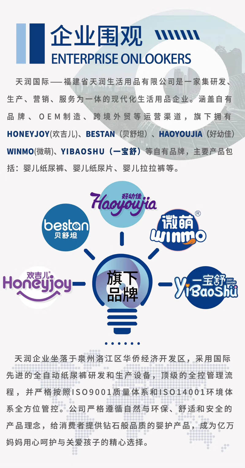 天潤(rùn)國(guó)際——福建省天潤(rùn)生活用品有限公司是一家集研發(fā)、生產(chǎn)、營(yíng)銷、服務(wù)為一體的現(xiàn)代化生活用品企業(yè),涵蓋自有品牌、OEM制造、跨境外貿(mào)等運(yùn)營(yíng)渠道,旗下?lián)碛?HONEYJOY(歡吉兒)、BESTAN(貝舒坦)、HAOYOUJIA(好幼佳)、WINMO(微萌)、YIBAOSHU(一寶舒)等自有品牌,主要產(chǎn)品包括:嬰兒紙尿褲、嬰兒紙尿片、嬰兒拉拉褲等。