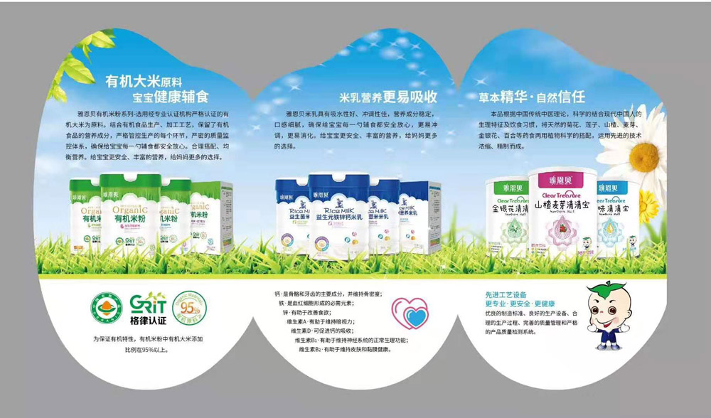 “雅恩貝”是江西永正食品有限公司旗下主打品牌,公司成立于2016年5月26日,是國家制定新政后的新型嬰幼兒輔食企業(yè)。企業(yè)已經(jīng)通過嬰幼兒配方谷粉食品生產(chǎn)許可證(證號(hào):SC10636012111666)和ISO22000食品安全體系認(rèn)證。本著“專業(yè)執(zhí)著,精益求精”的工作原則,秉承“品質(zhì)至上,客戶為本”經(jīng)營理念,研制生產(chǎn)了適合嬰幼兒健康營養(yǎng)需要的米粉類,清火寶類,葡萄糖類等系列產(chǎn)品。