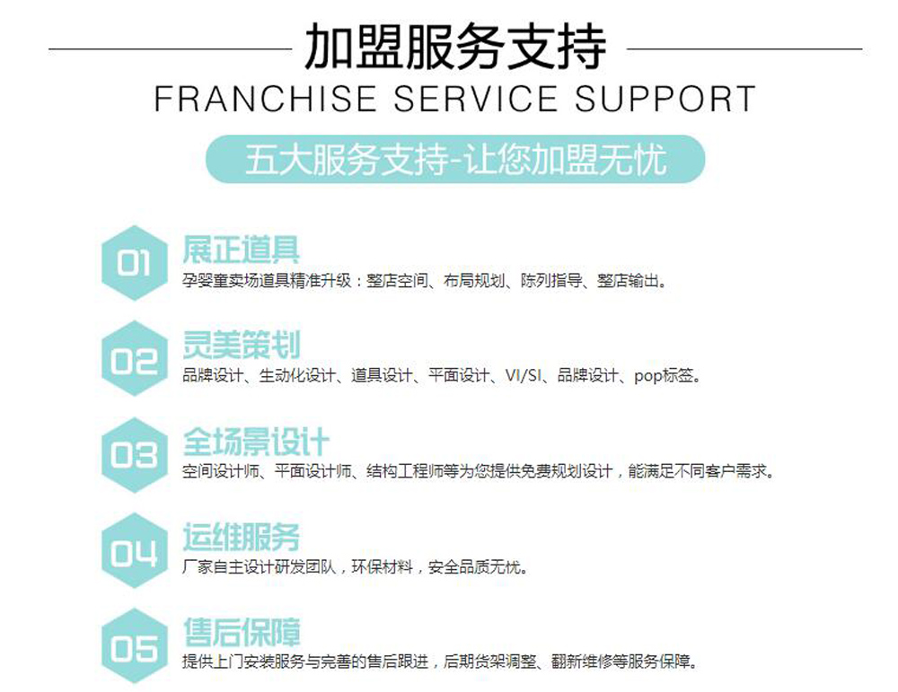 公司推出“母嬰終端零售展示道具、母嬰終端代理商、專營店、品牌連鎖加盟的整店輸出一站式服務(wù)”。公司不但擁有高素質(zhì)的設(shè)計團隊:空間設(shè)計師、平面設(shè)計師、結(jié)構(gòu)工程師等為您提供免費規(guī)劃設(shè)計,能滿足不同客戶需求,真誠感謝長期支持和信賴,我們的朋友!