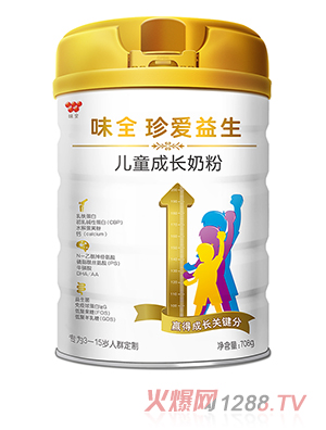 “味全珍愛益生兒童成長奶粉”,添加乳鐵蛋白、初乳堿性蛋白、水解蛋黃粉、鈣1000mg/100克,助力骨骼生長,滿足新一代父母對孩子身高的訴求;添加N-乙酰神經(jīng)氨酸、磷酯酰絲氨酸、;撬帷HA/AA,為大腦提供關(guān)鍵營養(yǎng),智慧成長;添加益生菌、免疫球蛋白IgG、低聚果糖、低聚半乳糖,呵護(hù)消化吸收,增添自身防御能力。