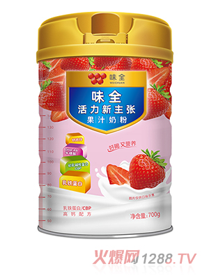 “味全活力新主張果汁奶粉”,甄選優(yōu)質(zhì)奶源,采用先進(jìn)工藝制作,乳鐵蛋白益生菌高鈣配方。乳鐵蛋白,天生抵御力;水解蛋黃粉30mg/100克,鈣1000mg/100克,并富含鐵、鋅,開創(chuàng)成長新高度;DHA+AA+牛磺酸,開啟思維動力,暢享智慧未來;乳雙岐桿菌,營養(yǎng)好吸收;天然果汁味,好口感,早晚一杯,均衡營養(yǎng)好成長。