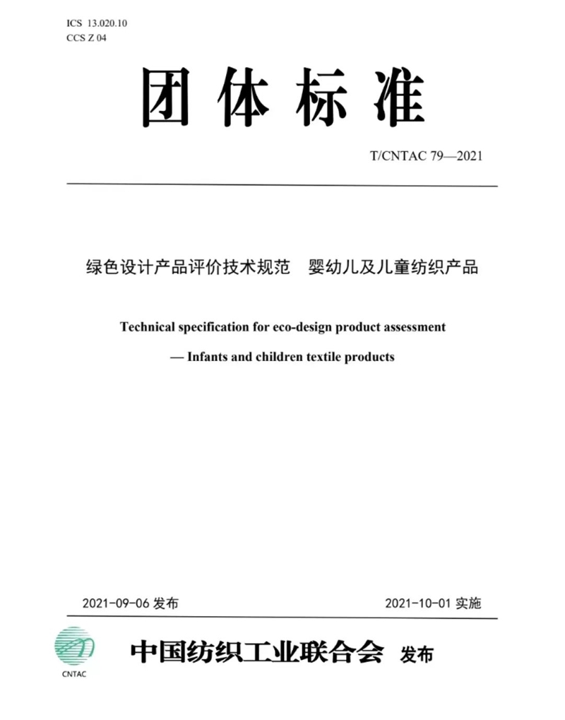 由中國紡織工業(yè)聯(lián)合會牽頭聯(lián)合多家嬰童服裝企業(yè)專家經(jīng)過3年多時間編制的“綠色設(shè)計產(chǎn)品評價技術(shù)規(guī)范—嬰幼兒及兒童紡織產(chǎn)品”團體標準《T/CNTAC79-2021》已于2021年9月6日發(fā)布,并于2021年10月1日起實施,標志著綠色童裝產(chǎn)品認證啟動!
