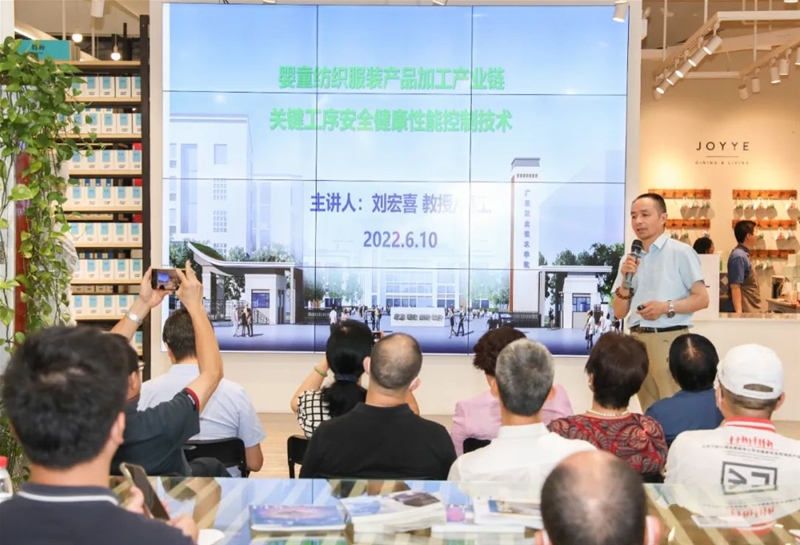 會議還邀請了廣東職業(yè)技術(shù)學(xué)院劉宏喜教授作了《嬰童紡織服裝產(chǎn)品加工產(chǎn)業(yè)鏈工序安全健康性能控制技術(shù)》主題演講,闡述了服裝生態(tài)紡織品概念、綠色原材料和綠色染整工藝,要加強原材料選購和檢測,增強企業(yè)的自控能力,生產(chǎn)出綠色生態(tài)的生態(tài)紡織服裝產(chǎn)品。