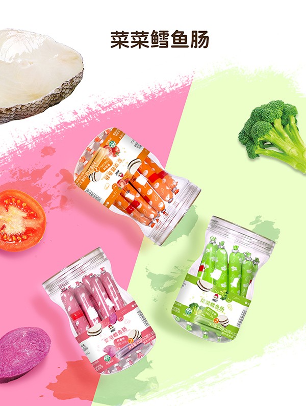 果蔬妃【菜菜鱈魚腸】創(chuàng)新融合蔬菜與鱈魚肉,鱈魚加蔬菜,營養(yǎng)更全面,色澤誘人,配方安全,更有番茄、西蘭花和紫薯三種口味可選!