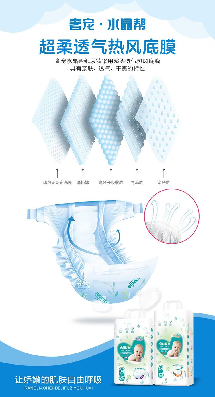 在實用性上,貝嬌兒更是精益求精。采用0.1cm纖薄設(shè)計,輕薄無負擔,不束縛寶寶活動,讓寶寶輕松學爬學步。內(nèi)置進口高分子吸水材料,小身材蘊藏大能量,搭配超柔超薄空氣芯與全方位瞬吸導(dǎo)流技術(shù),即便多次尿量也能快速吸收鎖存,拒絕鼓包、拒絕斷層,更能有效防止尿液回滲,讓寶寶屁屁整夜保持干爽,安享優(yōu)質(zhì)睡眠,也讓寶媽告別頻繁換紙尿褲的煩惱。獨特的凸點設(shè)計進一步減少肌膚接觸面,加速潮氣散發(fā),讓舒適感再升級。